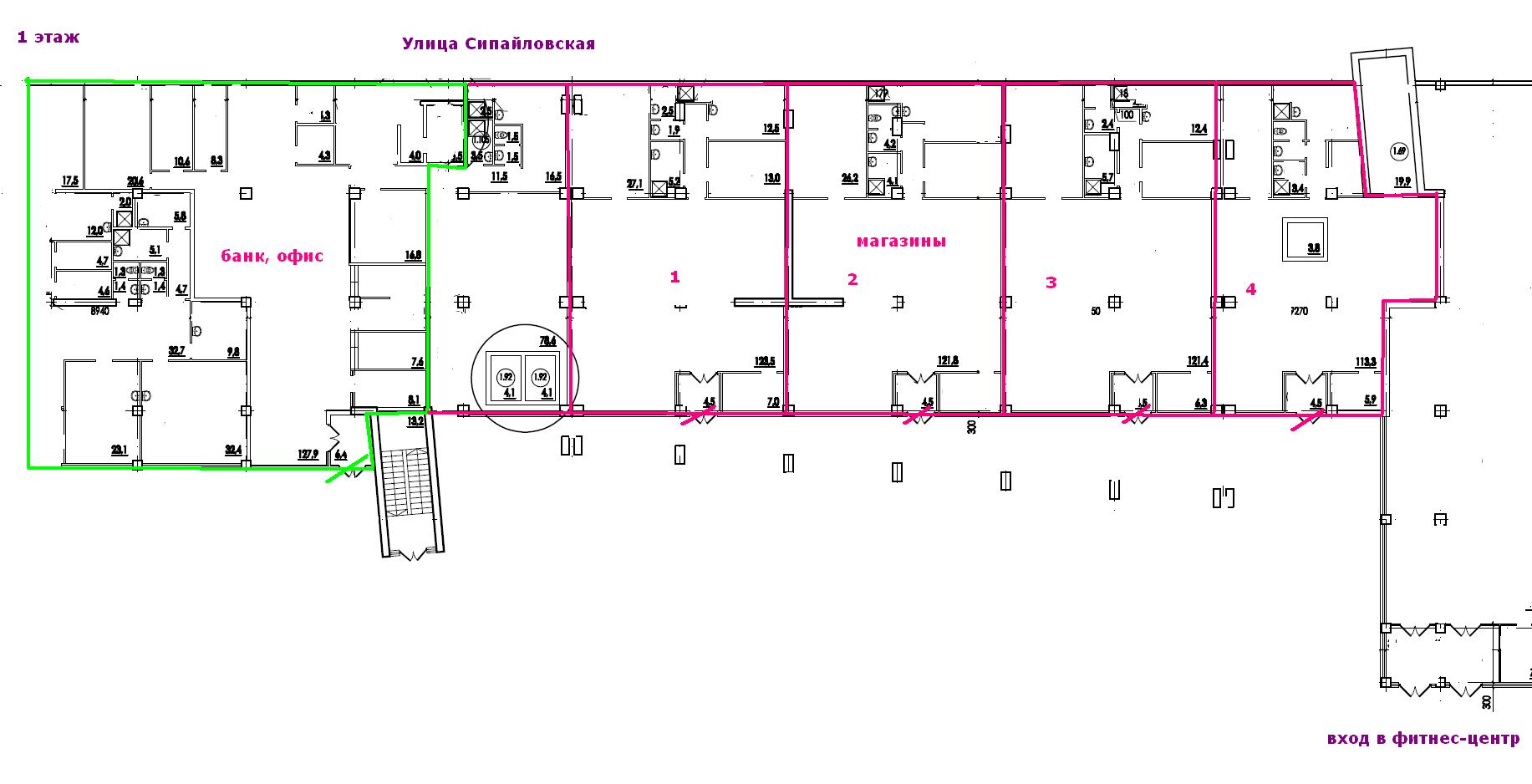 | 2 | 2 | Магазины или клиентские офисы. Центральная часть 566 кв.м. левая часть, которую можно рассматривать отдельно - 597кв.м. | Центральная часть: 54,7+70,5+75,5+74,3+72,5+ коридоры и подсобные. В центральный блок ведет отдельный дополнительный к основному в здание вход с улицы | 566, 597, 1160 | с УЛИЦЫ возможна организация нескольких входов, помимо существующего | да | 3,5 | индивидуально | 45 | план посмотреть | ||