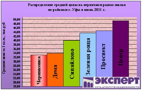 Средняя цена 1 кв.м. на первичном рынке жилья в г. Уфе по всем типам квартир в июне 2011 года составила 43,3 (+/-0,57) тыс.рублей, изменение за 3 месяца -0,1%: