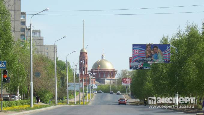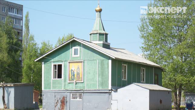 Взамен старенькой и тесной церквушки напротив на ул. Комсомольской строится новый собор с золотыми куполами и колокольней.