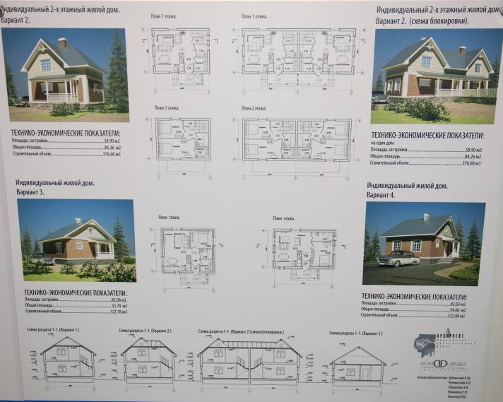 Индивидуальный 2-этажный жилой дом (сверху слева): площадь застройки 58,9 кв.м., общая площадь 84,97 кв.м., строительный объем 376,6 м3.