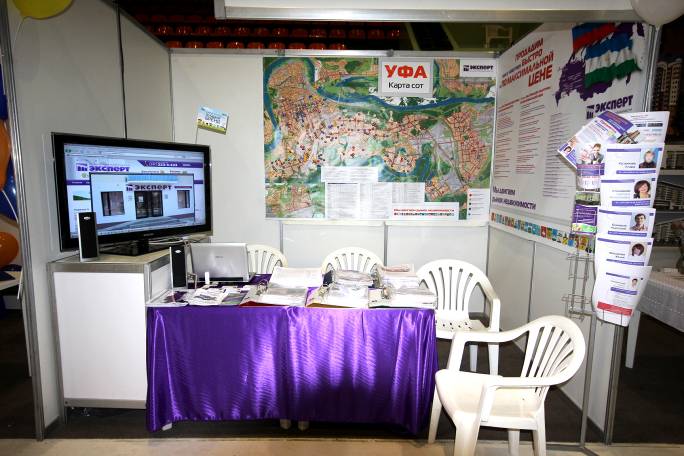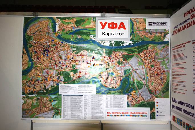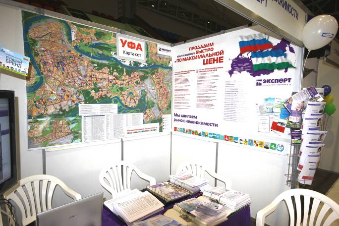 На стенде Компании «ЭКСПЕРТ» вниманию посетителей была предложена карта Уфы со всеми объектами, предлагаемыми к продаже уфимскими офисами. Всего более 250 объектов вторичного жилья и более 45 новостроек.
