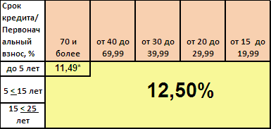 - при минимальном первоначальном взносе 15% устанавливается ставка 12,5%