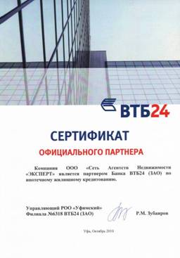 ВТБ-24, подтвердив Сертификатом партнера долгосрочные и и стабильные отношения с Сетью Агентств Недвижимости «ЭКСПЕРТ», предлагает ипотечным заемщикам беспрецедентные условия по кредитам: