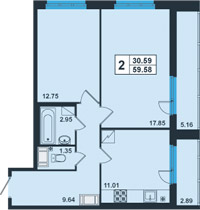| Общая площадь:59.58 м.кв. Количество комнат:2 Площадь кухни:11.01 м.кв. 72.9 тыс.руб/кв.м. Балкон/лоджия:2 лоджии Отделка:да |