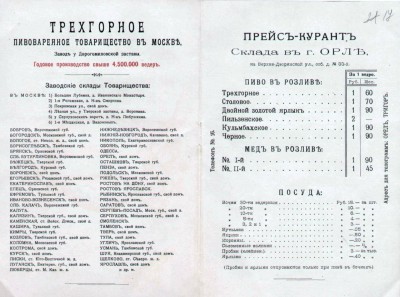 Для сравнения стоимости дома с ценами на другие товары приводим прейскурант цен на пиво, составленный приблизительно в то же время, что была совершена купчая между орловскими мещанками Марией Максимовной Ишковой и Екатериной Ивановной Вырковой.