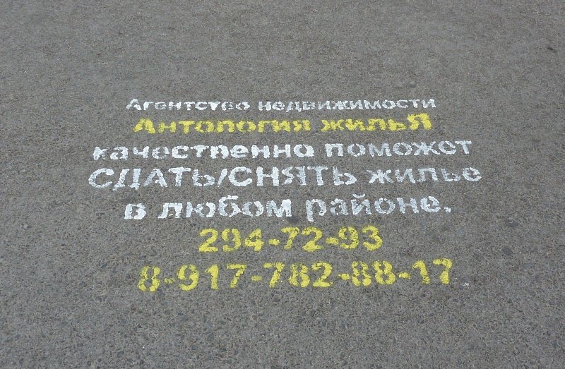- реклама на асфальте. Креативная идея появилась совсем недавно. Нужно гораздо меньше – идея, трафарет и акриловая краска для наружных работ. Зато какой эффект – проходя мимо, обязательно вытянешь шею, чтобы прочитать, кто же это столь смел, что позволил топтать свой логотип ногами тысяч прохожих? Хочется продолжить крылатую фразу: «рукописи не горят..», а известность не затопчешь!