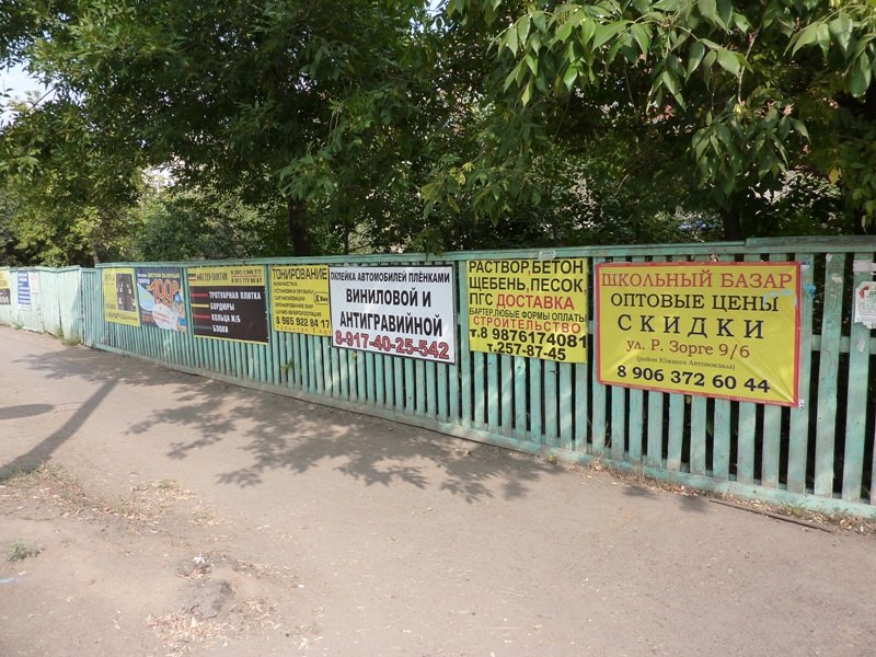 - реклама на заборах, собственно, классика рекламного жанра. Видимо, незаслуженно канувшая в лету. Непонятно, кто должен отвечать, а кто – требовать соблюдения каких-либо норм. Если забор принадлежит какой-то организации, например, застройщику, строящему дом на данной территории, то все понятно. А если забор ограждает небольшое расстояние между соседними домами и стоял там испокон веку? Главное – мелкоприметное место где-то в глубинке жилых кварталов, читаемость и лаконичность текста, и правильно подобранное цветовое сочетание.