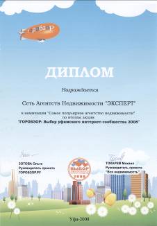 Конкурс от уфимского позитив-портала «ГОРОБЗОР: Выбор уфимского интернет-сообщества – 2008» стартовала 1 ноября в уфимском Интернете. В течение месяца уфимские Интернет-пользователи выбирали события, компании и заведения в различных номинациях. Победителями среди агентств недвижимости стала Сеть Агентств Недвижимости «Эксперт» (34%) и еще одно агентство недвижимости, набравшее тоже 34%.