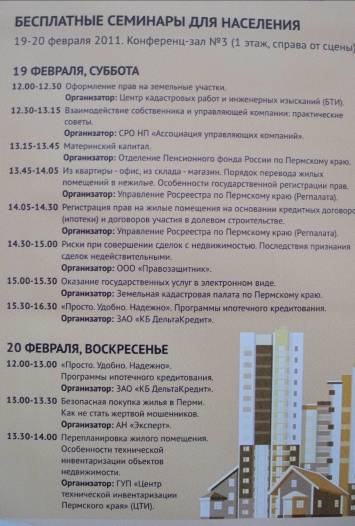 Офис «ЭКСПЕРТ» - Пермь в рамках консультационной секции выставки все три дня проводил консультации населения и посетителей выставки по вопросам операций с жильем. Также в рамках программы бесплатных семинаров офис провел 20 февраля семинар на тему «Безопасные сделки с жильем. Как не стать жертвой мошенников»