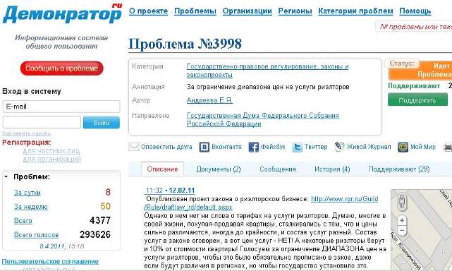 С помощью известного сервиса Демократор.ру, некоторое время назад был организован сбор подписей о внесении дополнений в проект закона о риэлторской деятельности, вынесенным на обсуждение риэлторского сообщества Российской Гильдией Риэлторов.