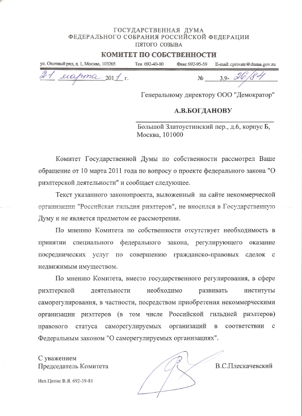 Таким образом, Комитет считает, что в законе о риэлторской деятельности необходимости нет.