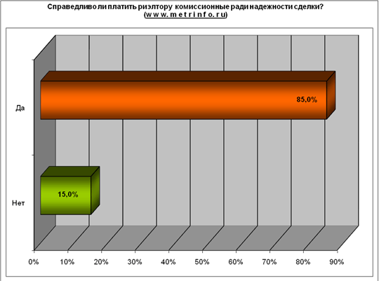 Схожие данные мы получили, задав вопрос о готовности наших собеседников платить риэлторам комиссионные. Безусловное и неоспоримое большинство опрошенных нами москвичей – 85% считает справедливым, что риэлторам за надежно проведенную сделку приходится платить солидные проценты вознаграждения. 15% с этим не согласны и платить не хотят. Эти люди в принципе не верят посредникам, полагают, что риэлторы занимаются «махинациями», не гарантируют надежности сделок, дорого берут за свои услуги и поэтому лучше все сделать самим.