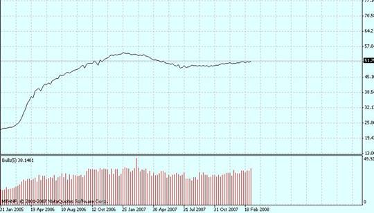 Рис.5. Индикатор Боллинджера показывает уровни поддержки-сопротивления. Резкое сужение полос всегда показывает изменение тенденции (начало 2007 – на падение, октябрь 2007 – на рост). Долгосрочное сужение показало снижение волатильности и уравновешивание рынка.