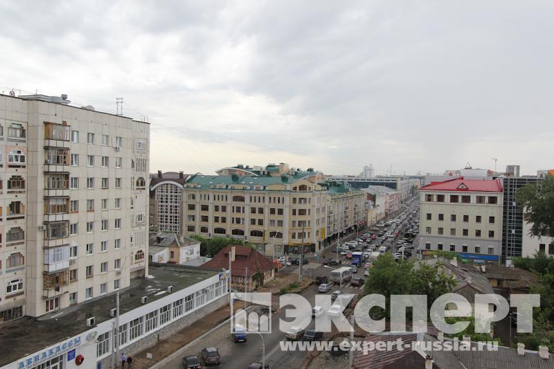 Окна выходят на 3 стороны: зал и кухня в части лоджии - на СВ, второе окно кухни и первое окно спальной - на ЮВ (на ул.К.Маркса), второе окно спальной - на ЮЗ. Светлая, грамотно спланированная квартира с прекрасным видом на старый центр Уфы.