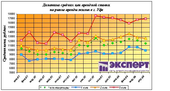 В апреле 2008 г. средняя стоимость аренды жилья в г. Уфе по всем типам квартир составила 11 480 рублей. За месяц цена понизилась на 5,1%.