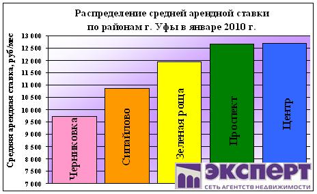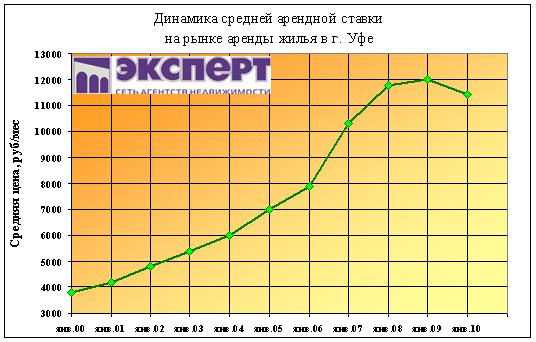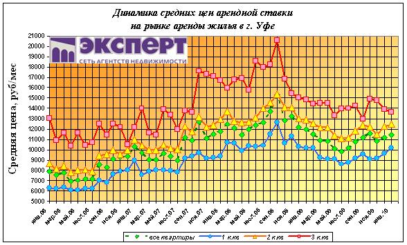 В январе 2010 г. средняя стоимость аренды жилья в г. Уфе по всем типам квартир составила 11 420 рублей. За месяц арендная ставка выросла на 2,1%.