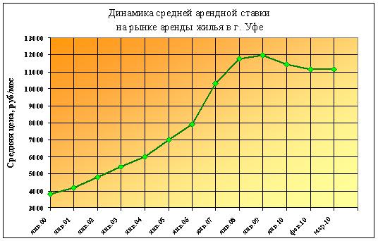 В марте 2010 г. средняя стоимость аренды жилья в г. Уфе по всем типам квартир составила 11 164 рублей. За месяц арендная ставка выросла на 0,4%.