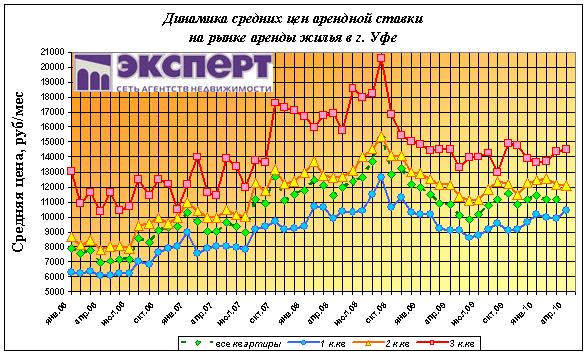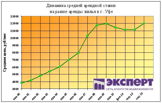 В апреле 2010 г. средняя стоимость аренды жилья в г. Уфе по всем типам квартир составила 12000 рублей. За месяц арендная ставка выросла на 7,5%.