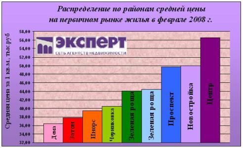 Средняя цена 1 кв.м. по всем типам квартир в феврале 2008 г. составила 46,7 (+/-0,93) тыс.рублей, изменения за месяц: +0,6%: