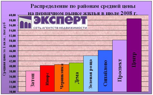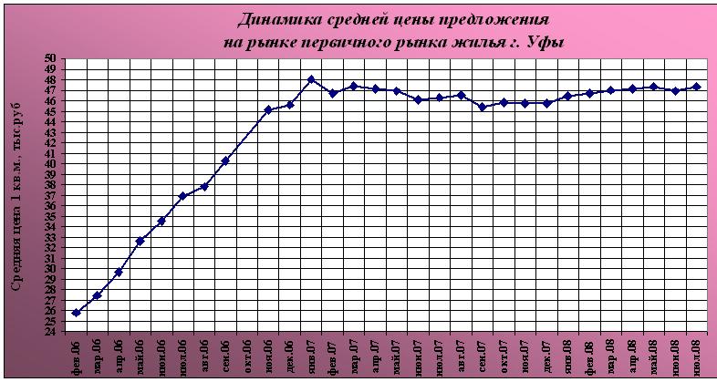 Средняя цена 1 кв.м. на первичном рынке жилья в г. Уфе по всем типам квартир в июле 2008 г. составила 47,3 (+/-0,95) тыс.рублей, изменения за месяц: +0,9%: