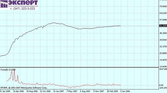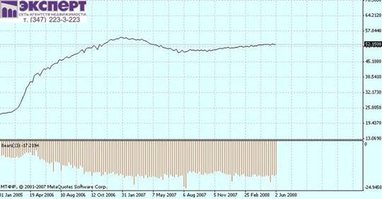 На рис.3 индикатор силы покупателей нацелен на снижение цены на рынке недвижимости. Торги в недвижимости представляют собой борьбу покупателей ("быков"), стремящимся поднять цену вверх, и продавцов ("медведей"), толкающих цену вниз.