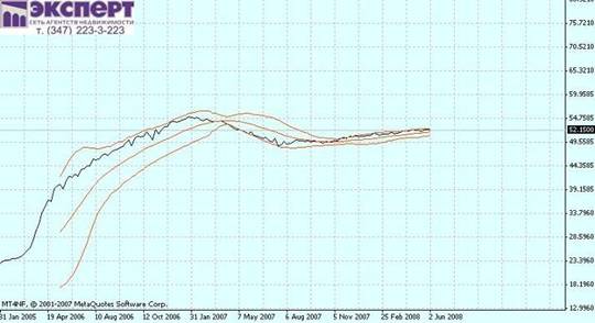 Резкое сужение полос всегда показывает изменение тенденции (начало 2007 – на падение, октябрь 2007 – на рост). Долгосрочное сужение показало уравновешивание спроса-предложения.