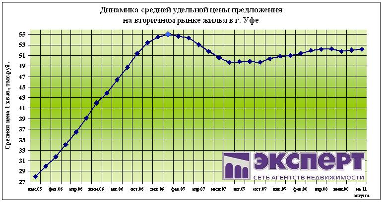Так по данным Росстата на 1 августа 2008 года инфляция составила 9,3 % с начала 2008 года. В то же время цены на жилье в Уфе выросли за этот период всего на 3,0%. Можно говорить о том, жилье в августе 2008 года стало дешевле относительно «стоимости денег» по сравнению с началом 2008 г.
