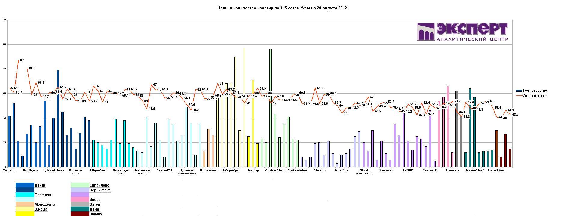 Средние цены на квартиры Уфы в 115 микрорайонах Уфы. Диапазон изменения цен по микрорайонам и типам квартир составил на 20 августа 2012 года от 40 (Шакша) до 80 (Центр, ул. Гоголя и М.Карима) тыс.руб\кв.м.