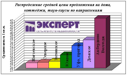 Среднее значение удельной цены предложения по всем домам, коттеджам, таун-хаусам составило 30,7 тыс.руб./кв.м. Минимальное значение удельной цены предложения –1 млн.200 тыс.руб. (дом в Кушнаренково, 80 кв.м.), максимальное – 32млн. руб. (коттедж в Зубово, 450 кв.м.).