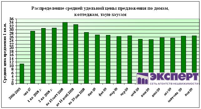 Среднее значение удельной цены предложения по всем домам, коттеджам, таун-хаусам составило 26,6 тыс.руб./кв.м,