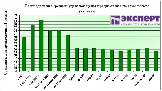 Среднее значение удельной цены предложения по всем зем.участкам составило 53,7 тыс.руб./сотка,
