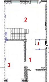 На первом этаже, как и в доме первого типа, расположены прихожая (1), кухня-столовая (2), гостевой санузел (3), гараж на 1 автомобиль (4).