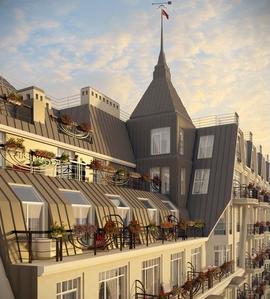 Парадный фасад жилого комплекса на улице Чапаева, готическая башня с флюгером и яркая игра кровель мансардных этажей формируют интересный облик нового здания. Оригинальная ступенчатая архитектура прекрасно дополняет неповторимую концепцию современного здания на Петроградском острове.