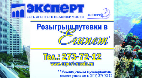 Агентство недвижимости «Эксперт», на Театральной 5/1, представляет акцию «Путешествие за наш счет». Если Вы или Ваши знакомые стоят перед выбором покупки, обмена, продажи или других вопросов связанных с решением жилищных проблем, при заключении договора с агентством «Эксперт» в период с июля по декабрь месяц 2010 г. – становитесь участником розыгрыша путевки в Египет.