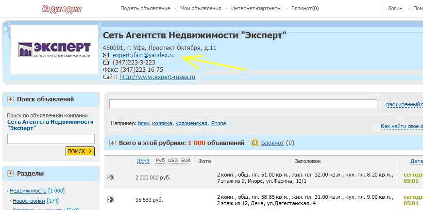 Также обращаем внимание, что адрес электронной почты, указанный вверху страницы сайта «ИРР» ( желтая стрелка на слайде ниже) не является адресом ведущего объекты риэлтора. Это общий адрес, куда вы можете выслать общие вопросы.