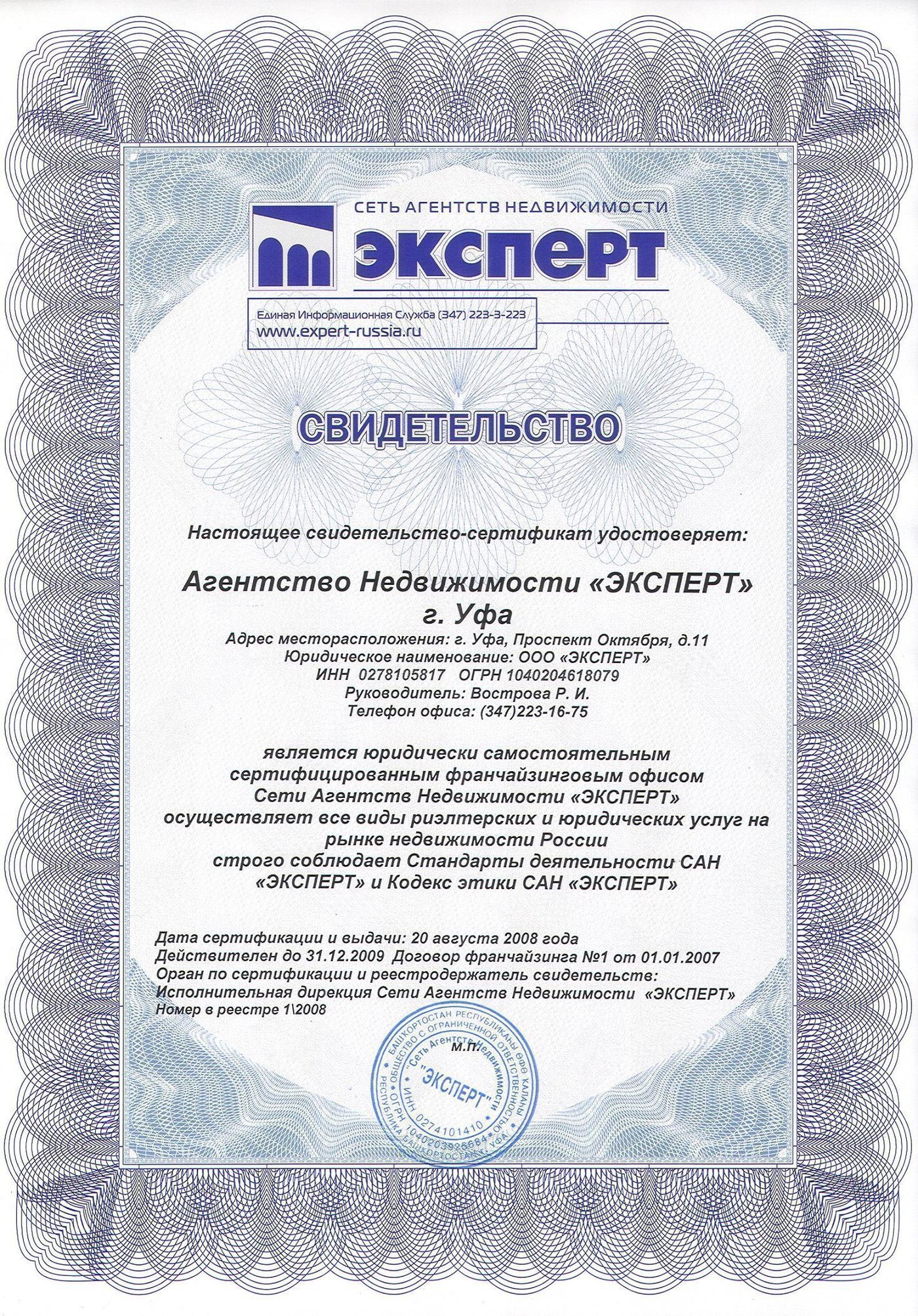 - Номер Свидетельства-Сертификата в реестре франчайзинговых офисов САН «ЭКСПЕРТ»